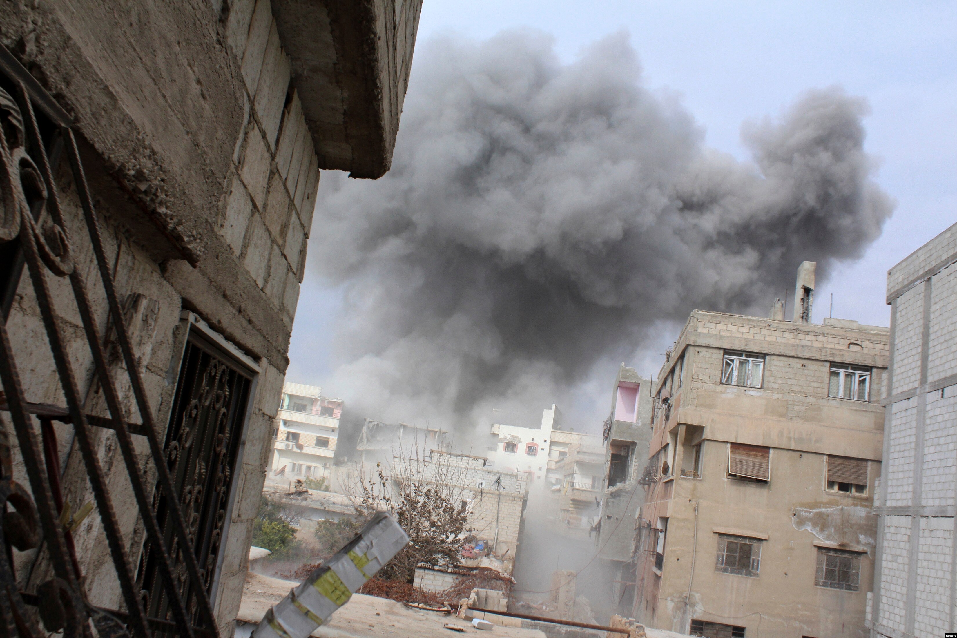 - Smoke rises from what activists said were explosive barrels thrown from helicopters on Daria outside Damascus, Jan. 12, 2014.